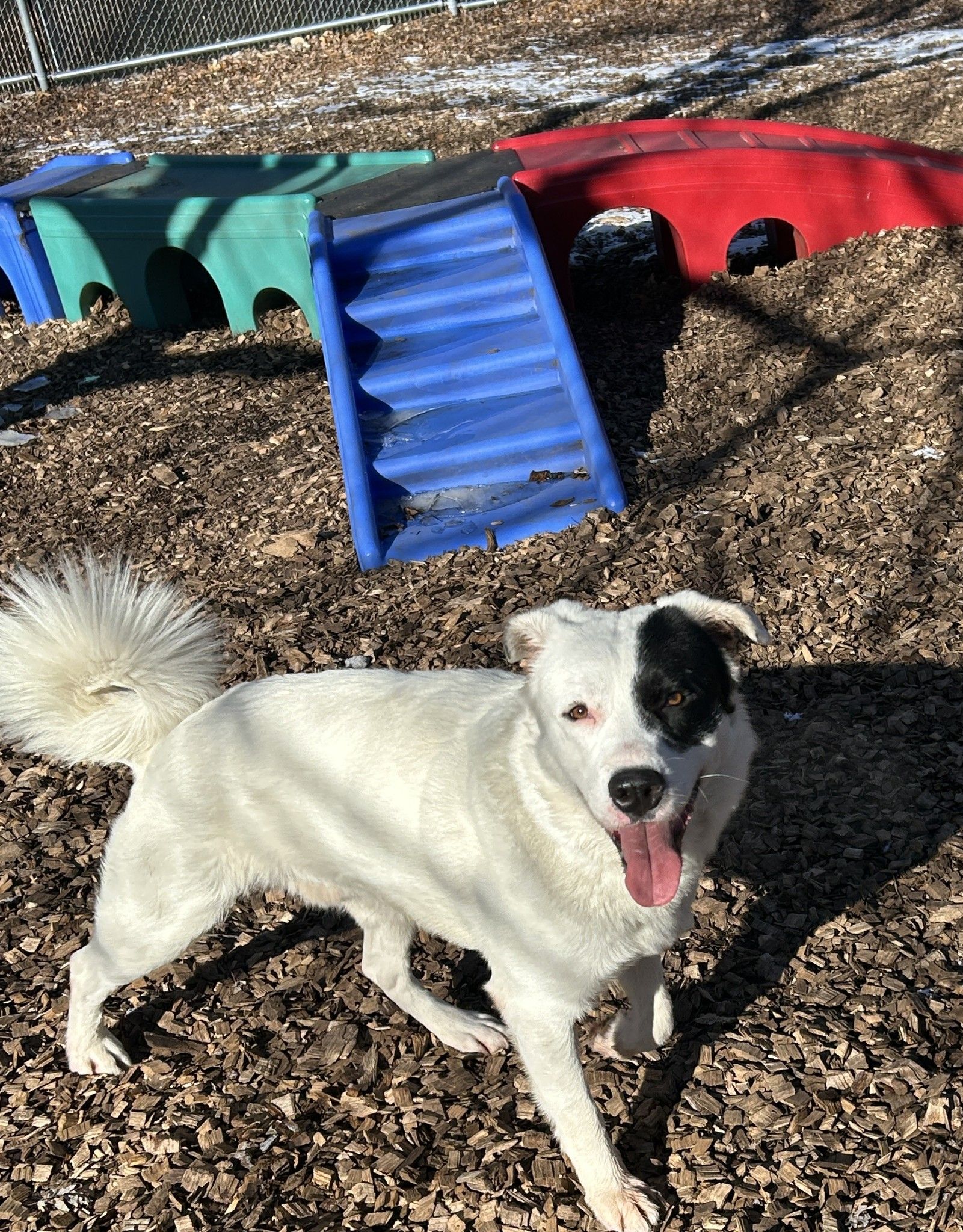 Look at that spot! Max is at Howard County Animal Control who believes he is a great pyrenees with some husky in him. They believe that because in their words, “he can be vocal.” I bet he also loves the snow.