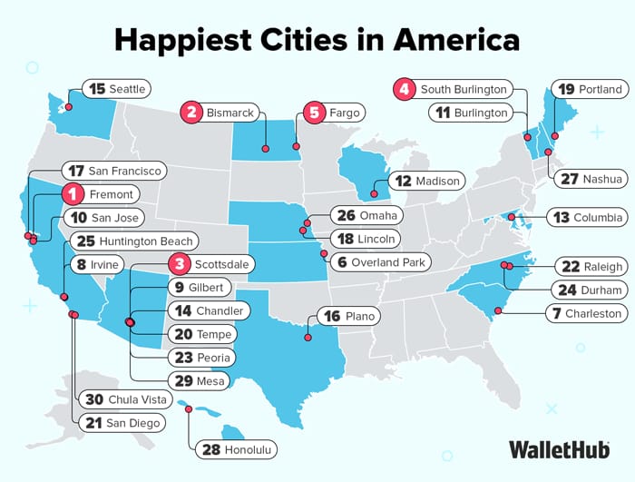 They looked at 180 cities and used 29 key indicators of happiness to score every city. All indicators fit into three categories: emotional & physical well-being, income & employment, community & environment.