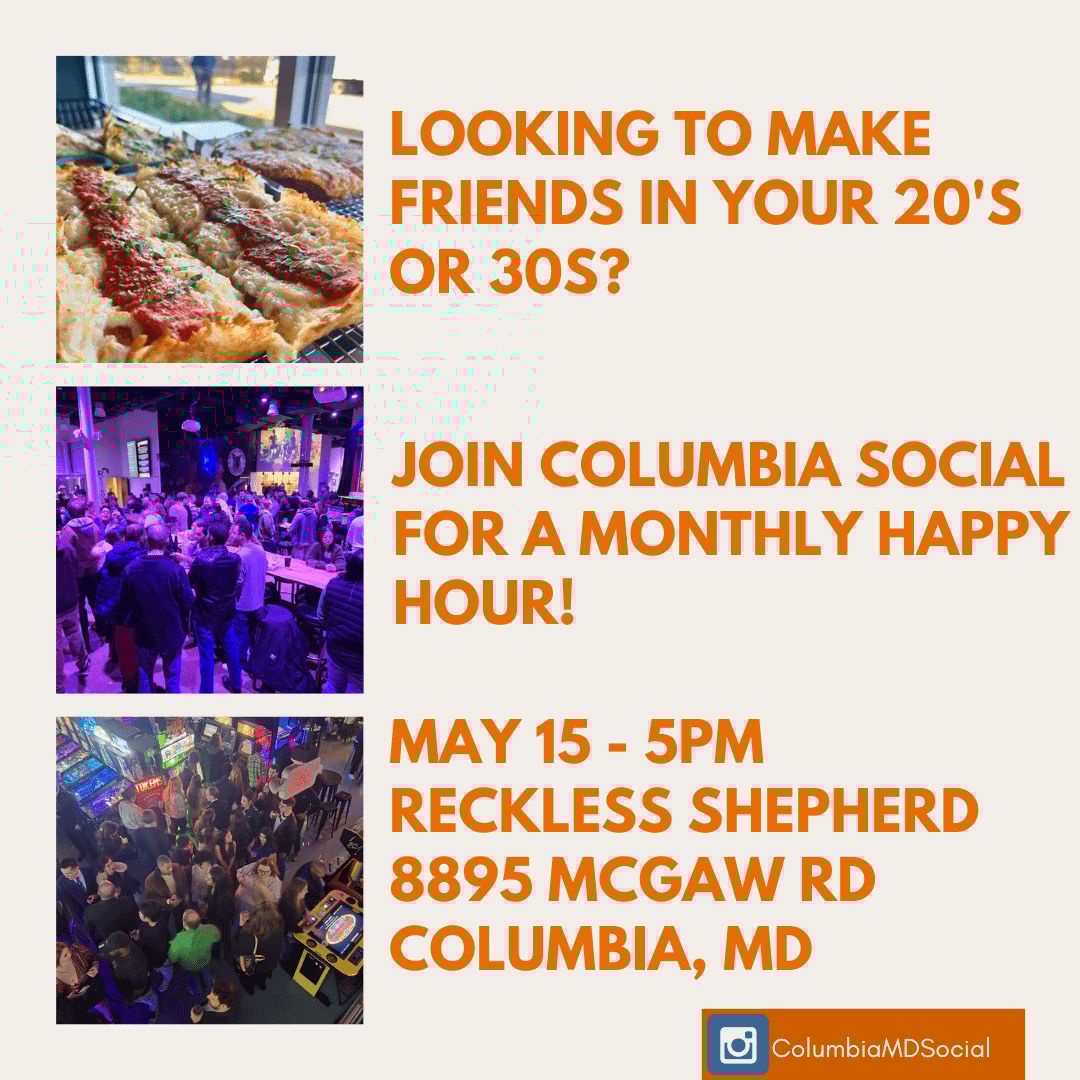 Ready to meet new people? Columbia Social’s monthly happy hour is back May 15, 5pm at Reckless Shepherd. Good vibes, cold drinks, and new friends await. Don’t miss it!